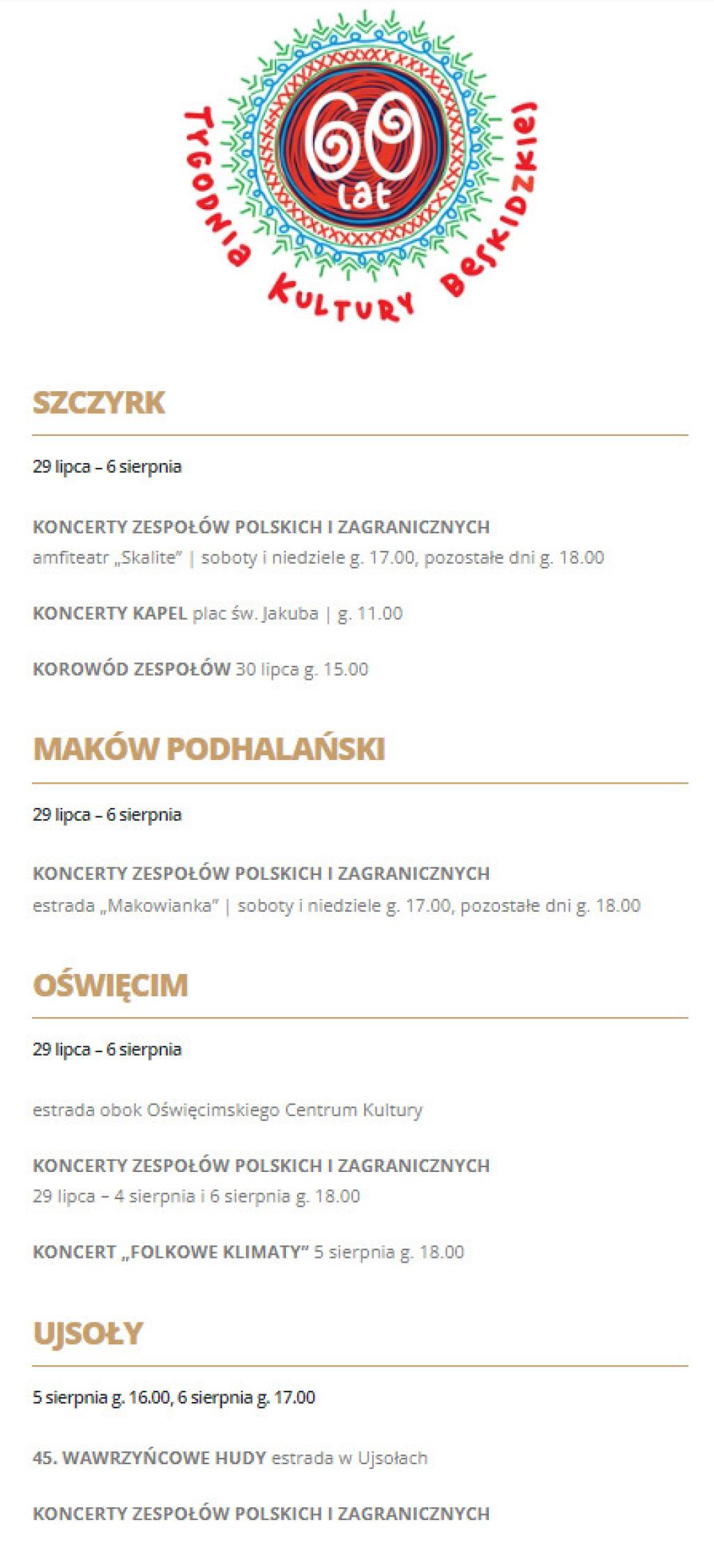 60. Tydzień Kultury Beskidzkiej będzie odbywał się przez 9 dni (od 29 lipca do 6 sierpnia) w 5 miejscowościach: Wisła, Żywiec, Szczyrk, Maków Podhalański, Oświęcim oraz trzech towarzyszących: Istebna, Ujsoły, Jabłonków (Republika Czeska).