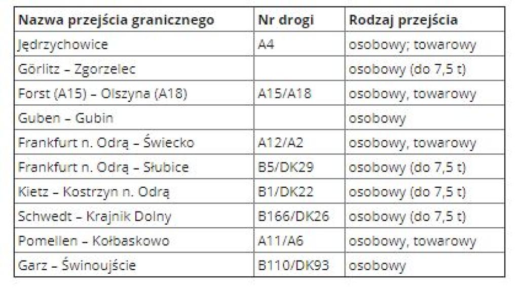 Osoby wracające z Niemiec do Polski samochodem, busem lub autokarem mogą korzystać z przejść granicznych zawartych w tabeli.